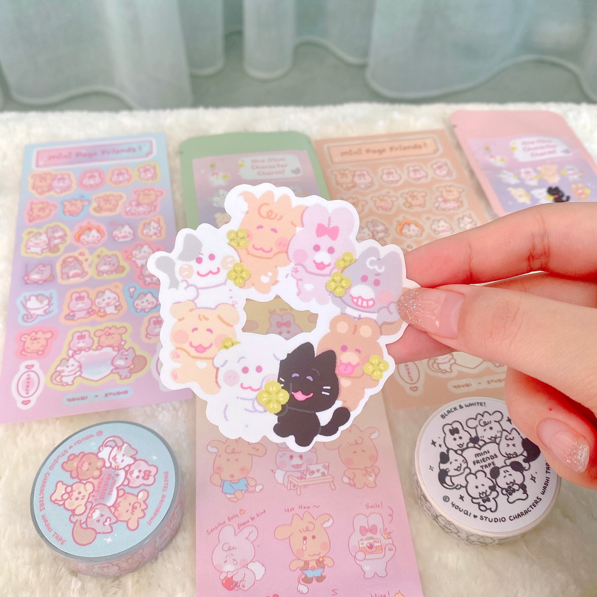 A biggg matte CLEAR flake sticker featuring all the new and classic Youqi characters including bon bon, moo moo, Fuji and Alex etc